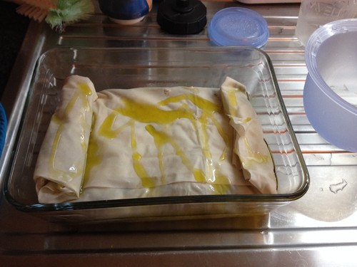 Aqueça o forno a 200ºC. Coloque uma folha da massa filo numa superfície de trabalho. Pincele levemente com azeite, cubra com outra folha e volte a pincelar. Repita o processo para as restantes folhas.